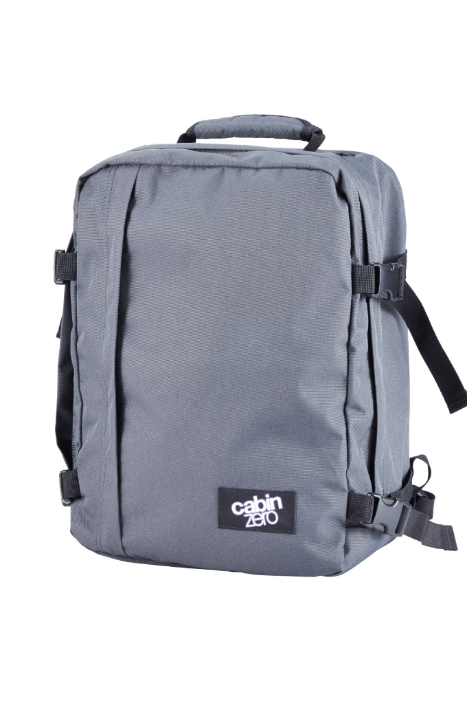 Mochila-bolsa de viaje de la marca Cabin Zero, robusta , ligera y funcional. Tiras para llevar a la espalda acolchadas . Tambien dispone de asa superior y asa lateral para poder llevarlo de mano. En el interior compartimento acolchado para poder llevar el portatil y bolsillos con cremallera. Recubrimiento resistente la agua. Perfecto para llevar en el avion debajo del asiento. Medidas 39 x 29,5 x 20 , con capacidad de 28 Ltrs. Color Gris.