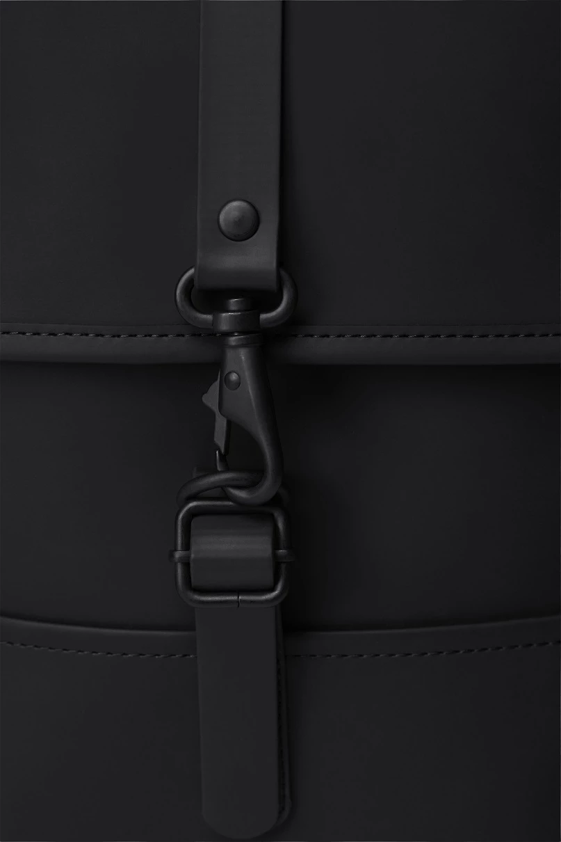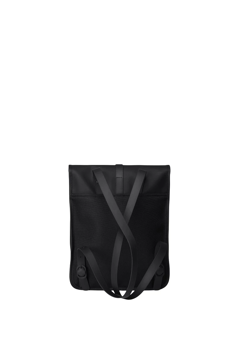 Mochila de la marca RAINS, el tamaño mas pequeño de todos (micro).Compartimento principal único, y bolsillo trasero de seguridad. Bolsillo interno con cremallera. Correas de la espalda engomadas y regulables. Solapa superior con cierres a presion magneticos , y luego con el caracteristico mosqueton . Su confección con poliuretano la hace toatlmente impermeable. Capacidad para ordenador de 11″ .Color Negro