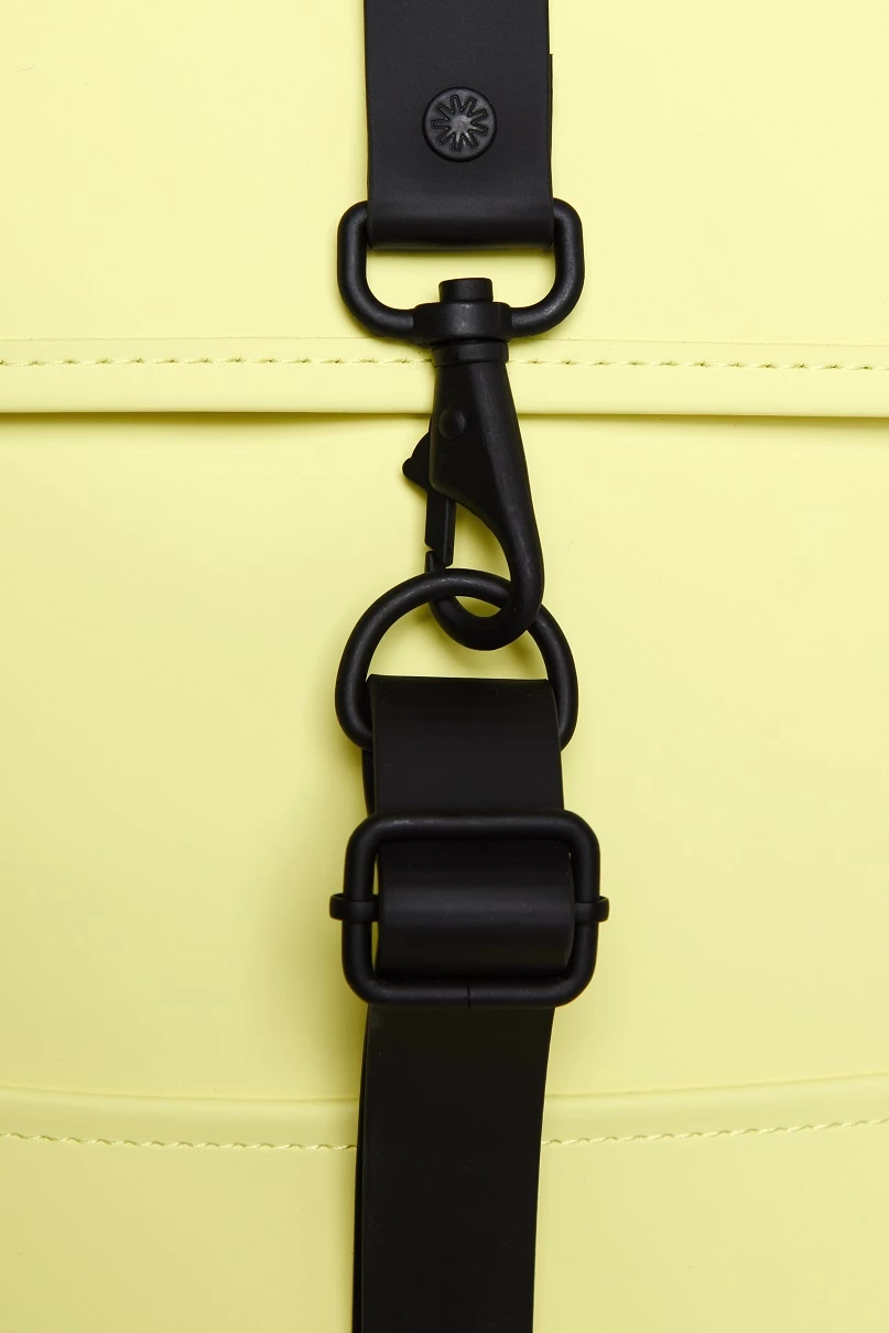 Mochila de la marca RAINS, tamaño mini.Compartimento principal único, y bolsillo trasero de seguridad. Bolsillo interno con cremallera. Correas de la espalda engomadas y regulables . Solapa superior con cierres a presion magneticos , y luego con el caracteristico mosqueton . Su confección con poliuretano la hace toatlmente impermeable. Capacidad para ordenador de 13″ con funda , o de 15″ sin funda.Color amarillo.