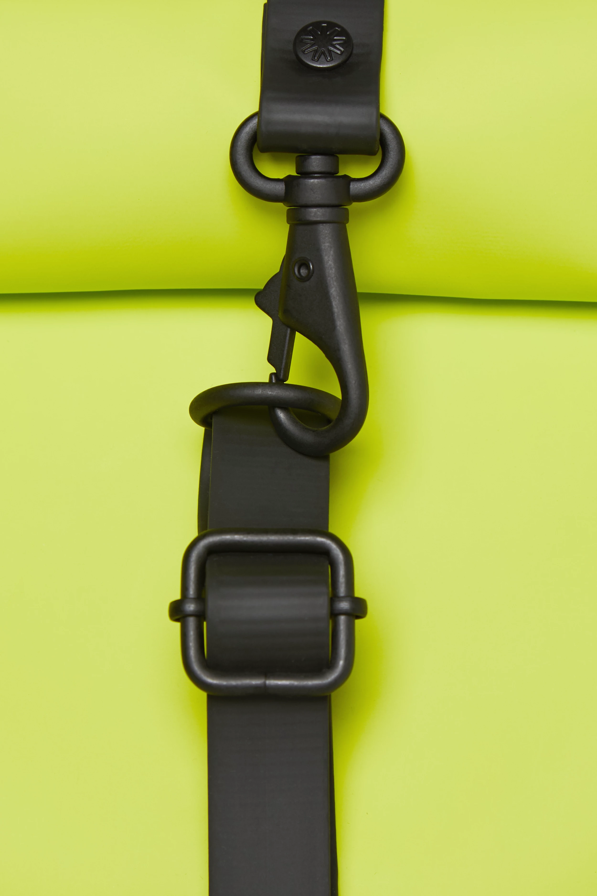 Rains Rolltop Rucksack Mini color lima es una versión más pequeña de la clásica mochila Rolltop Rucksack de la marca. El diseño de este bolso es una versión de Rains de una mochila ciclista, con detalles que tradicionalmente usa la comunidad ciclista. Confeccionada con el tejido impermeable característico de Rains, esta mochila funcional tiene un cierre superior enrollable con una correa ajustable que está diseñada con un lazo para candado de bicicleta. Rolltop Mini tiene un compartimento principal y se completa con una parte trasera acolchada, correas ajustables para los hombros y herrajes originales de Rains. Color lima