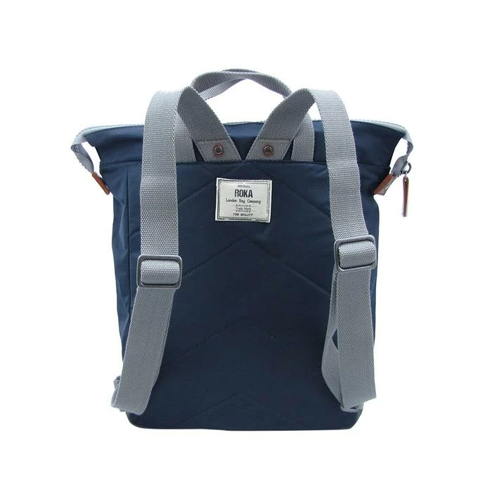Mochila urbana modelo Bantry B de la marca Roka London de tamaño mediano en color azul midnight con cierre de cremallera y de nylon más lona resistente. La mochila tiene un compartimento interior para ordenador de 15,6 pulgadas además de otros dos bolsillos de cremallera. En el exterior hay un bolsillo de cremallera. Las correas son de algodón para una mayor comodidad.